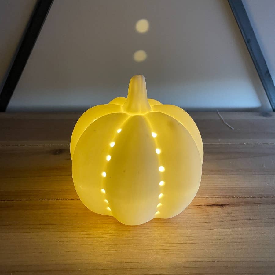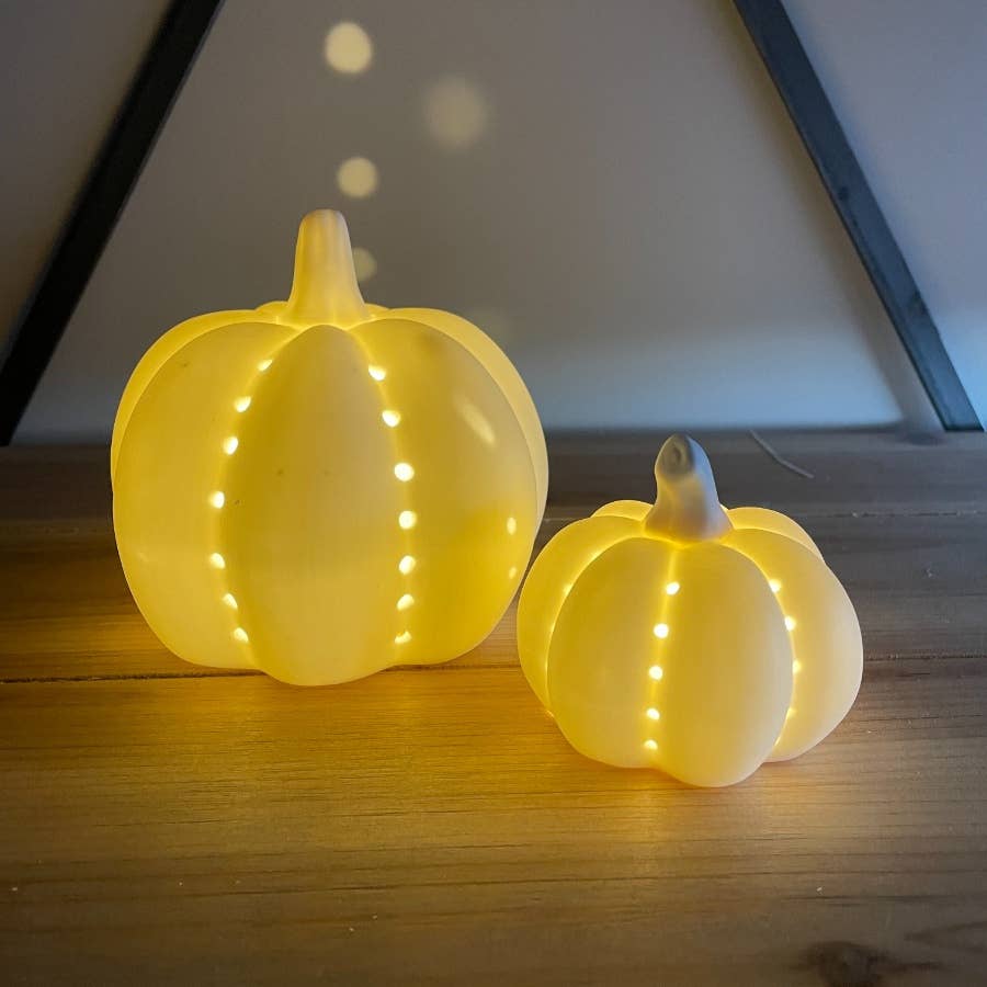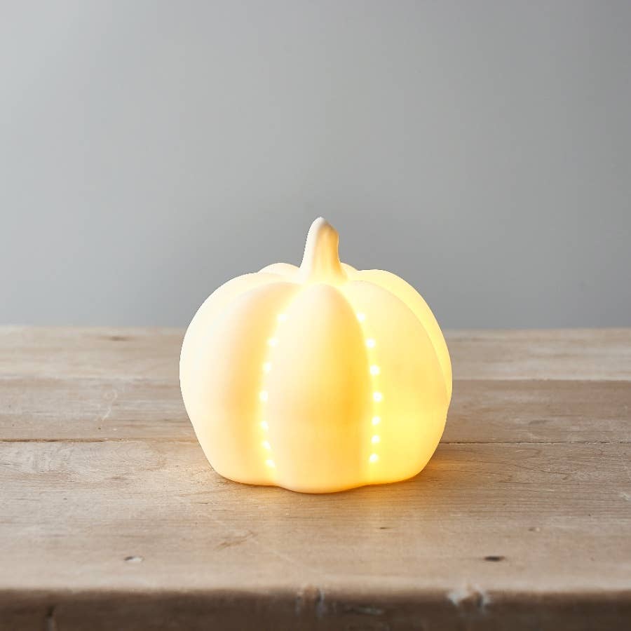 Large ceramic pumpkin in a matte white finish, featuring a warm LED centre. Perfect for offering a charming feature in your home this autumnal season.