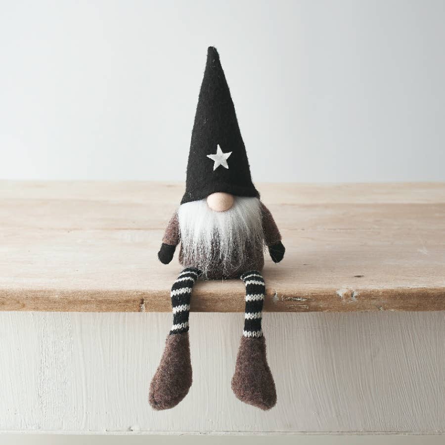 Add a fun addition to your halloween decor with this small dangly legged gonk, complete with a tall point witchy hat, fuzzy beard and monochrome stripped legs.